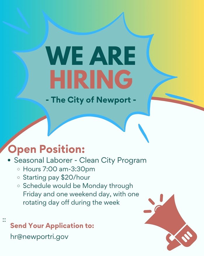 The City of Newport is presently receiving employment applications for the following position(s). Applications will be accepted in the Human Resources department, located within Newport City Hall, until the closing date noted below. If no positions are listed below, this would signify "No Current Job Openings". SIGN UP to receive notification of ALL City positions, including upcoming recruitment periods for Newport Police Officer and Firefighter, by providing your name and E-mail address to: HR@newportri.gov.